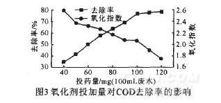 隨著氧化劑投加量的增加,COD去除率也迅速增加。但是同時氧化指數也不斷降低,單位計量的氧化劑氧化能力不斷降低。當投藥量達到80mg/100mL廢水時,去除率達到63.5%,氧化指數2.18。繼續投加氧化劑,COD去除率增加減緩,而氧化指數迅速下降。因此確定氧化劑投加量為80mg/100mL廢水。