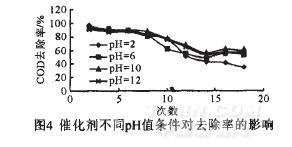 圖4結果表明對于活性艷紅的催化氧化實驗,堿性條件下的處理效果都好于酸性條件下的處理效果。活性艷紅分子在堿性條件下發生構象變化,從而更易于ClO2的進攻。酸性條件下COD去除率下降較堿性條件下快,表明酸性條件下催化劑載體上的活性組分流失較快,對催化氧化的效果也會產生不利影響。催化氧化活性艷紅的最佳pH值為10。