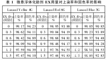 微懸浮體化助劑EX-1和EX-2在染浴中與染料發生作用,其用量直接影響染料微懸浮體化的程度,從而影響染料對纖維的上染百分率和固色率。取染料用量為6%(owf),改變懸浮體化助劑EX的用量,所得上染百分率和固色率結果如表1所示。