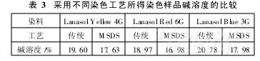 由表3可以看出,采用微懸浮體染色工藝可使羊毛纖維在染色過(guò)程中的受損程度顯著降低。這是因?yàn)槲腋◇w染色工藝采用的是快速升溫,縮短了羊毛纖維在高溫階段的受熱時(shí)間。而傳統(tǒng)染色工藝必須采用慢速升溫,否則會(huì)引起染色不勻。受熱時(shí)間的不同導(dǎo)致了羊毛纖維受損傷程度的差異。