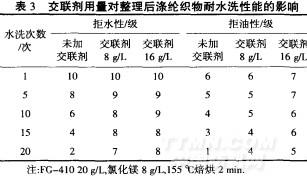 從表3可以看出,隨水洗次數的增加,未添加交聯劑整理的織物拒水拒油效果下降很快.而添加交聯劑整理的織物盡管初始拒水拒油效果與未添加交聯劑整理的織物基本相同,但耐洗性得到明顯改善.水洗20次后,添加交聯劑的織物仍可保持較優的拒水拒油性能,尤其是交聯劑用量為16g/L,整理后織物拒水性仍可達8級,拒油性也可達5級.原因是交聯劑兩端的反應性基團可分別與纖維和整理劑反應,將纖維與整理劑牢固地結合起來,在纖維上形成三維網狀結構,增加了纖維分子間滑移的摩擦阻力,減少了水洗過程中纖維表面整理劑的洗除.[5]綜合考慮,選擇交聯劑用量16g/L.