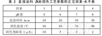 試驗條件 本試驗中,pH值、浸漬時間、固色溫度和固色劑濃度這四項工藝參數,通過正交試驗得到。正交設計的因素水平見表2。固色后,90℃烘干。