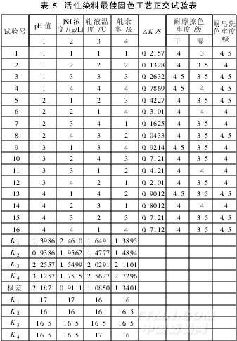 (1)直接染料最佳固色工藝參數的確定為了得到最佳固色工藝參數,根據給定布樣和固色劑JXH用量情況下,設計正交試驗,L16(44)結果見