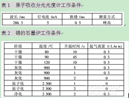 AA240FS原子吸收光譜儀、GTA120石墨爐原子化器和熱解涂層石墨管(美國瓦里安公司),自動進樣器(具有自動稀釋,自動加基體改進劑功能),錫空心陰極燈(北京曙光明電子光源儀器有限公司),CEMMARS微波消解儀(美國CEM公司),MILLIQ純水發生器(美國Millipore公司)。