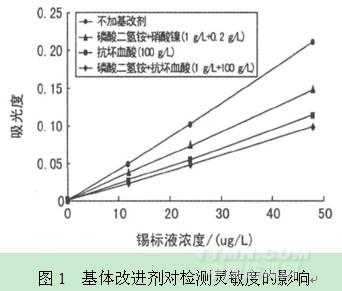 為消除樣品中復(fù)雜基體對(duì)待測(cè)元素測(cè)定結(jié)果產(chǎn)生的干擾,基體改進(jìn)劑已廣泛應(yīng)用于石墨爐原子吸收法[3]。錫在測(cè)定過(guò)程中易形成揮發(fā)性的化合物,因此必須選擇一種合適的基體改進(jìn)劑,消除基體干擾,從而提高測(cè)定靈敏度。文獻(xiàn)報(bào)道[4-6]的基體改進(jìn)劑有磷酸二氫銨、抗壞血酸、硝酸鎳、硝酸鉀、硝酸鈣和硝酸鈀等。移取消解樣品(還原藍(lán)20)10mL于25mL容量瓶中,分別加入標(biāo)樣至12,24,48μg/L,定容,其中消解樣品中錫含量未檢出,忽略不計(jì),以下同?;一瘻囟群驮踊瘻囟葏⒖纪呃锇灿脩?hù)手冊(cè),分別選用800℃和2600℃。選用幾種常用的基體改進(jìn)劑,考察其對(duì)錫標(biāo)準(zhǔn)溶液吸光度的影響,結(jié)果見(jiàn)圖1。