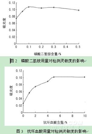 如圖2所示,磷酸二氫銨用量大于0.1%時(shí),吸光度趨于穩(wěn)定;但隨著其用量增大,樣品溶液易爆沸,所以用量選擇0.1%??箟难嵊昧看笥?%時(shí),吸光度趨于穩(wěn)定,所以用量選擇5%。