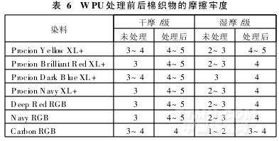 由表6可以看出,WPU對不同活性染料染色織物處理后,織物濕摩擦牢度顯著提高,都達到3級以上,有的甚至達到4~5級。其中,黑色活性染料染色織物濕摩擦牢度的提高最為明顯。染色織物的干摩擦牢度