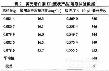 通常用于紡織印染行業(yè)的熒光增白劑ER產(chǎn)品有液狀和粉狀(配有分散劑等助劑),其紫外吸收約為熒光增白劑ER(原粉)的1/5,熒光增白劑ER(液狀產(chǎn)品)溶液數(shù)據(jù)見表2.