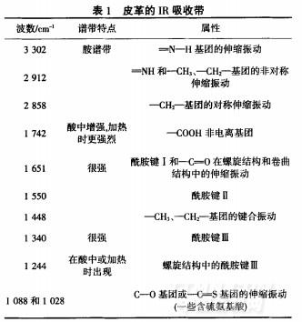 圖1和2分別是牛皮和羊皮的MR光譜圖.從圖1、圖2中可以看到,皮革光譜有一些很重要的吸收帶,如3300 ,2910 ,2860 ,1742 ,1650, 1550, 1445、1340,1244、1088和1028cm,在1268和804cm-'時(shí),牛皮與羊皮光譜中吸收帶不同是因?yàn)閮煞N皮革的化學(xué)構(gòu)造不同.而在約2400cm-1時(shí)的吸收帶是由環(huán)境中的一氧化碳引起的.表I解釋了分子振動(dòng)的屬性.