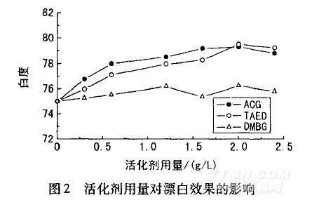 由圖2知,三種漂白活化劑的漂白效果依次為ACG>TAED>DMBG,這與圖1的結(jié)論一致。由圖2還可以看出,隨著DMBG用量的增加,漂白織物的白度并沒有明顯的提高,且織物白度也不高,因此并不適合作為棉織物雙氧水低溫漂白活化劑。比較ACG和TAED,隨著兩者用量的增加,漂白后織物的白度逐漸提高,當(dāng)ACG用量達到1.6g/L時,再增加其用量,白度提高不很明顯。這是因為當(dāng)ACG用量達到1.6g/L時,吸附在棉纖維表面的乙酰胍陽離子已達飽和,再進一步增加乙酰胍用量,對漂白白度影響不大。