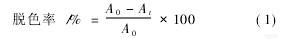 配制0. 01 g/L的雷馬素藍RGB溶液,分別試驗不同溫度、pH值、酶濃度和處理時間對染料脫色率的影響。用分光光度計在最大吸收波長下,測定洗液脫色前后的吸光度,脫色率按式(1)計算: