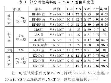 表1列出了國內常用的幾只活性染料上述S、E、R、F的差值和比值。