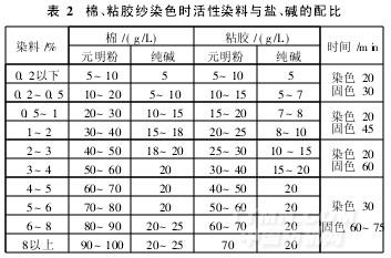 生產中,染料、助劑的用量和配比,是根據染料對溫度、時間、浴比、鹽、堿和pH值等不同的依存性,以及設備的特性而定的,特殊情況下可作微調。例如,KN-R艷藍在55~60℃染色較合適,元明粉最高用量為50 g/L(采用大浴比化元明粉時,用量可適當提高);如果用磷酸三鈉代替純堿,則用量是純堿的一半;大豆纖維、玉米纖維和竹纖維的染色,純堿用量不得高于20 g/L等。表2列出了棉、粘膠紗染色時活性染料與鹽、堿的配比。