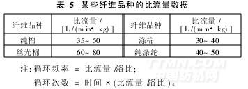 染色時,染液的比流量、循環次數和循環頻率相互間具有一定的關系。通過測定比流量數據,可以計算出每分鐘循環次數(次/min)。例如浴比1∶8,比流量為30 L/(min·kg),則每分鐘循環次數為3~4次(表5)。