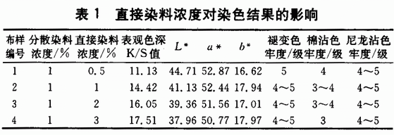 用分散紅S一5BL,直接紅Intralite 12B,在分散染料濃度為1%(owf),直接染料濃度分別為0.5%、1%、2%、3%(owf)時(shí),對(duì)織物進(jìn)行染色,并測(cè)試染色織物的表觀色深K/S值,色度指標(biāo)L*、a*、b*及耐水洗色牢度,結(jié)果見(jiàn)表1。