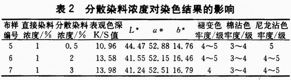 由表1可看出,分散染料濃度一定時(shí),隨著直接染料濃度的增大,總的K/S值增大明顯,明度值L*降低,織物表面顏色加深,a*值和b*值變化不明顯,而退色牢度和棉布沾色牢度都有所降低,尼龍沾色牢度不變。這是因?yàn)橹苯尤玖仙先久蘩w維,其水洗牢度對(duì)織物整體的影響顯著。