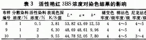 用分散紅S一5BL,活性艷紅3BS,采用分散/活性一浴二步法染色,在分散染料濃度為1%(owl),活性染料濃度分別為0.5%、2%和3%(owf)時(shí)對(duì)織物進(jìn)行染色,并測(cè)試染色織物的表觀色深K/S值,色度指標(biāo)L*、a*、b*及耐水洗色牢度,結(jié)果見(jiàn)表3。