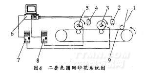 圖4所示為一個基于圖像識別技術的二套色圓網印花系統,其中計算機6為待印織物紋理圖形處理設備和運動控制系統的控制器.將圖像數據處理設備和運動控制器設置在同一計算機可簡化系統設計。進布裝置1將待印的織物送到印花毯9.線陣CCD2、線陣CCD4分別采集待印織物表面紋理圖象.作為織物表面經向定位參數:交流伺服驅動器7、交流伺服驅動器8根據計算機6的指令分別對交流伺服電機3、交流伺服電機5進行驅動:交流伺服電機3、交流伺服電機5分別對第一版和第二版的印花圓網進行驅動計算機為工業控制計算機.內置圖像采集卡和運動驅動卡分別作為CCD2、CCD4與交流伺服驅動器7、8的接口。