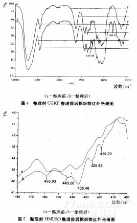 對比圖5(a'b)可以看出,經等離子體照射后在425cm-1處出現較強吸收峰為HMDSO中Si一O—C特征吸收峰j。說明整理劑HMDs0在等離子體照射下,發生化學反應,在棉纖維
