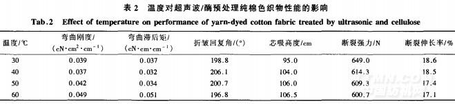 處理條件:超聲波40kHz,酶用量2.5%(0.W.f),浴比1:20,pH=4.5,溫度分別為30、40、50、60℃,處理50rain,然后將試樣晾干,充分調濕后進行柔軟整理。結果如表2所示。