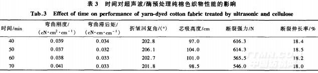 本文所用纖維素酶的溫度有效范圍是40~60℃,所以溫度選取30、40、50、60℃進行實驗。由表2可看出,溫度對純棉色織物的彎曲性能影響較大。溫度過低,酶的水解速率低,超聲波的機械作用也不能充分發(fā)揮,處理效果不理想;當溫度升高到40℃時,彎曲剛度和彎曲滯后矩達到最小,然后開始上升,這說明溫度過高,酶失活速度加快;折皺回復角隨著溫度的升高先增大后逐漸減少,同樣在40℃時達到最大值;而芯吸高度隨著溫度的升高逐漸增大,這是因為當溫度升高到一定范圍,纖維索酶失活以后主要是超聲波對織物的機械作用導致部分纖維之間孑L隙增大,故吸濕性能增強,而纖維強力受到較大損失,斷裂強力減少;斷裂伸長率隨著溫度的變化略有波動。綜上所述,適宜的溫度為40℃。