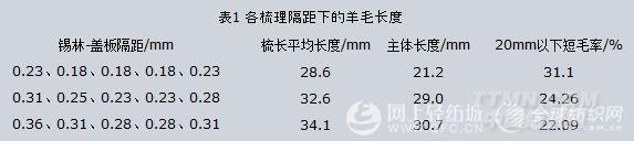紡紗過程中纖維損傷主要是由于梳理機梳理。對90支澳毛條(切斷長度為60mm)做對比試驗,在最終梳理效果基本不變的前提下,不同隔距和速比,梳后羊毛平均長度最多可相差5.5mm,2mm以下的短毛率可相差9.01%,實驗結果見表1。