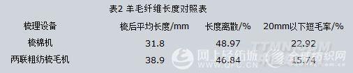 其他需進一步研究探討的設備包括:①毛條拉斷機取代切斷機。現在半精紡廠普遍使用的羊毛為切斷的毛條,切斷毛條在降低羊毛長度的同時,也使短毛率大大增加。為了能既降低羊毛長度又避免人為造成的短毛增加,正同設備人員探討以毛條拉斷機代替切斷機,只將超長纖維拉斷,避開切斷機長短纖維一刀切的缺陷,如果這一思路實現,將大大降低因毛條切斷增加的短毛率。②梳理機的改造。由于梳棉機錫林使用的是剛性鋸齒針布,在加強梳理作用的同時,也增加了對纖維的損傷,一道梳棉機梳理對纖維的損傷,甚至超過了兩聯粗紡梳毛機的彈性針布的損傷。表2為2種設備梳理后70支澳短條(平均長度58mm)纖維長度對照表。