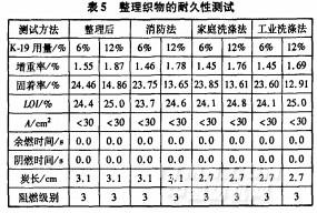 為了全面了解經阻燃劑整理后的織物阻燃性能,選擇三種日本標準工業洗滌法、家庭洗滌法和消防洗滌法,對阻燃織物的耐久性進行測試,結果見表5。