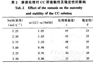 當NaOH溶液濃度低于2.25mol/L時得不到完全溶解的CC溶液,而在一’5~0條件下,CC在2.25mol/L的NaOH溶液中最多也只能形成質量分數為8.5%的CC溶液]。為實現CC/NaOH質量比≥1的目標,將上述溶解在2.25~3.5mol/LNaOH溶液中的CC按實驗方法進行滲透處理,然后測定溶液中CC/NaOH質量比、溶液黏度及溶液在10℃環境中穩定存在的時間,結果如表2所示。