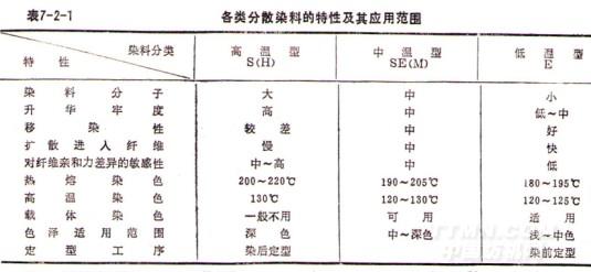 分散染料商品在國內通常是按滌綸的染色溫度分類,有高溫型、中溫型和低溫型三類。它們的特性見表7-2-1.