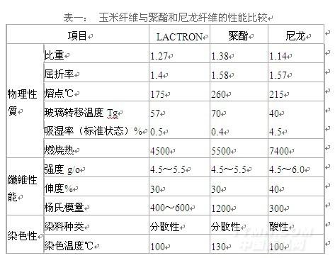 表一:玉米纖維與聚酯和尼龍纖維的性能比較