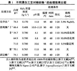 從表1可知,采用酶法對棉織物進行漂白,所得白度與傳統化學法效果較為接近;其中,用固定化酶所產生的白度效果基本上可以達到傳統H20漂白效果(不同的數據來源,結論可能存在偏差),對于一些染深色或對織物白度要求不高的情況,用GOD進行處理完全可以滿足要求.P。Anis等人[37187對漂白pH值的研究結果表明:雖然酸性或中性條件可以不用或少用堿劑,但是產生的漂白效果卻很不理想,最佳的pH值仍是堿性條件0o~il).而各最佳工藝的溫度條件還屬于高溫,因為低溫或室溫條件對白度提高并不明顯.[4]93由此看來,GOD對棉織物漂白雖然已經有了很大的進展,但是要想突破堿劑、高溫等條件的制約,達到傳統法漂白的效果,還需要進~步的研究.葡萄糖氧化酶雖然在棉織物漂白中的應用研究已有眾多成果,但在麻類織物中的漂白研究還未見報道,鑒于對棉織物漂白所產生的良好效果,相信GOD對麻類織物的漂白也將顯示出巨大的應用價值.