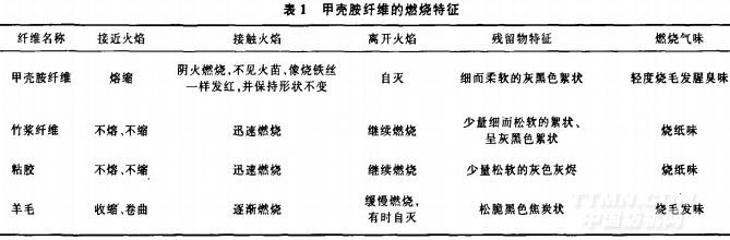 嗅其產生煙霧的氣味等。甲殼胺纖維和竹漿纖維、粘膠纖維、羊毛的燃燒特征見表l…。