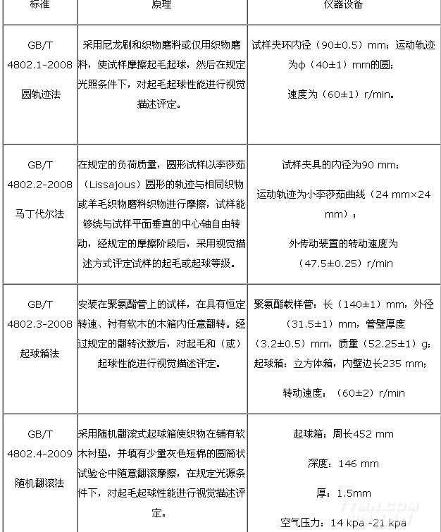 2008年全國紡織品標準化技術委員會發布了GB/T 4802.1-2008《織物起毛起球性能的測定 第1部分 圓軌跡法》、GB/T 4802.2-2008《織物起毛起球性能的測定 第2部分 改型馬丁代爾法》、GB/T 4802.3-2008《織物起毛起球性能的測定 第3部分 起球箱法》三個檢測織物抗起毛起球性能的標準,分別替代各自1997年版的標準,新標準從2009年3月1日開始實施。GB/T 4802.4-2009《織物起毛起球性能的測定 第4部分 隨機翻滾法》于2009年6月19日獲批準,將于2010年2月1開始實施。本文根據這四種織物起毛起球性能的不同檢測方法進行試驗,并對結果進行比較,同時對有多種測試條件的測試方法進行測試條件的比較,分析各測試條件對測試結果的影響,從而分析標準中指標的合理性、試驗方法的科學性及新舊標準的更替對產品標準產生的影響。