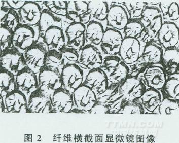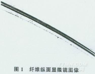 從圖1可以看出,纖維縱面呈透明的圓柱形態,有中腔(黑影部分)影像。從圖2可以看出,纖維橫截面有中腔,呈規則的圓形(也有多邊形的)。