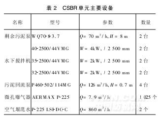 (2)CSBR池。尺寸74.18m×57.54m×7m,有效水深6.25m,HRT28h。厭氧池及缺氧池中設置水下攪拌器,好氧池安裝微孔曝氣器系統,采用漸減曝氣方式布置。由空氣主管供氣。根據池內溶解氧值的設定,調節每條空氣主管上的空氣調節閥。CSBR單元主要設備詳見表2。