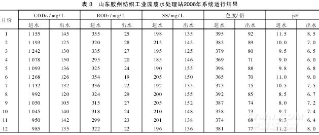 2006年系統運行結果見表3。處理后水質(平均):CODCr為132mg/L,BOD5為24mg/L,SS為143mg/L,色度為78.5倍,pH7.3,處理效果穩定,處理出水達到了《紡織染整工業水污染物排放標準》(GB42872—92)的二級標準。