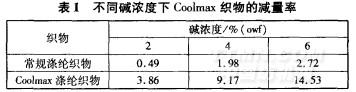 采用不同堿濃度對常規滌綸針織物和Coolmax導濕快于纖維針織物進行堿減量處理,結果見表1。