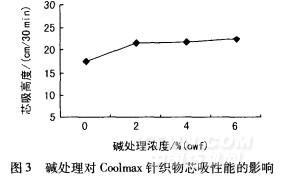 聚酯纖維的堿水解發生在纖維表面,纖維芯吸性能所受到的影響應該是多方面的。一方面,堿減量處理降低了纖維異形度,織物的芯吸性能降低;另一方面,聚酯纖維結構薄弱點處的堿水解速度較快,Cool—max纖維溝壑處常被纖維的齊聚物填塞,這是堿減量的作用點,通過堿水解作用,纖維溝壑處得到清理,織物的芯吸性能提高;此外,堿減量還會使纖維變細,織物結構在一定程度上變得疏松,也會提高織物的芯吸性能。Coolmax針織物堿減量處理后,其芯吸性能的變化見圖3。