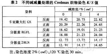 從表l可知,相同堿濃度下,Coolmax織物的堿減量率比常規滌綸針織物高。這是由于Coolmax纖維的比表面積大,燒堿的“剝皮”效應顯著。在2%、4%、6%owf堿濃下,Coolmax滌綸雙面針織物的減量率分別是常規滌綸織物的7.9倍、4.6倍和5.3倍??紤]到織物的克重,這類織物的減量率要控制在較低水平,因此燒堿濃度以2%為宜。具體堿減量工藝要綜合考慮織物的性能變化來決定。