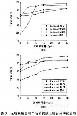 綸的等電點,兩種纖維均具有兩性性質,帶有較多的負電荷,染料陰離子需要克服較大的靜電斥力才能上染纖維。加入元明粉能夠降低纖維表面的Zeta電位.促進染料的上染。但是,元明粉用量過大,會導致染料的聚集度增加,甚至使染料發生沉淀,從而影響到染料的最終上染百分率,并造成一定的污染和浪費。所以,元明粉用量應控制在l5L左右。