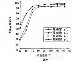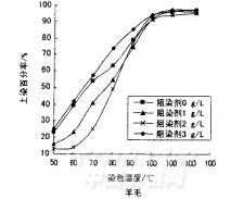 按1.2節工藝對羊毛和錦綸纖維進行染色,改變阻染劑用量,分別測定羊毛和錦綸纖維的上染百分率曲線,結果見圖4。