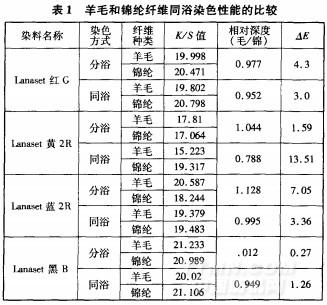 按選定工藝對羊毛和錦綸纖維進行分浴和同浴染色,測試羊毛和錦綸纖維的K/S值和色差△E(表1)。