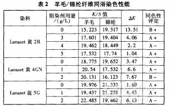 從表2知,隨著阻染劑用量的增加,錦綸得色逐漸變淺,羊毛逐漸變深,色差逐步變小;再繼續增加其用量,錦綸得色比羊毛還淺。通過試驗比較并結合工廠經驗發現,當羊毛和錦綸纖維的K/S差值≤2,E≤5,且錦綸顏色稍深于羊毛時,兩者的混紡織物能達到很好的同色性。依此標準,綜合表2及染色實樣的K/S值得出:染料Lanaset黃4GN和Lanaset藍5G不加阻染劑便能達到較好的同色性;而Lanaset黃2R只有在阻染劑用量為3~5g/L時,產品同色性才符合要求。