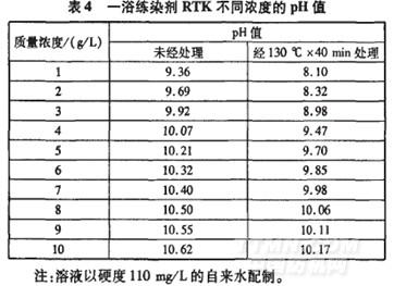 —浴練染劑RTK不同濃度的pH值變化情況見表4。