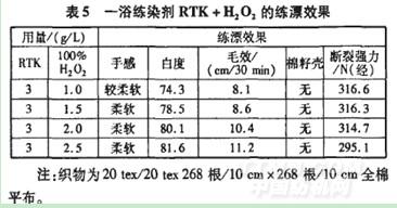 采用一浴練染劑RTK與H:O:對全棉織物進行同浴練漂,其效果見表5。