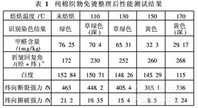 對純棉織物進行樹脂免燙整理,焙烘后剪取6 cm×4 cm試樣,稱重,進行染色試驗。免燙整理試樣的顏色、強力、甲醛含量和折皺回復角等結(jié)果見表1。