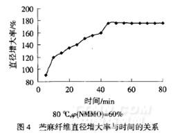 由圖4可知,處理5min后,直徑增大率只有90%;隨著處理時間的延長,直徑增大率逐漸上升;45minH~達到最大值,175%;再延長處理時間,直徑增大率的最大值并沒有改變.另外,在開始階段苧麻纖維的溶脹速度比后期快.