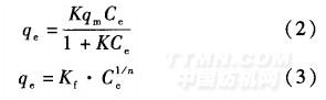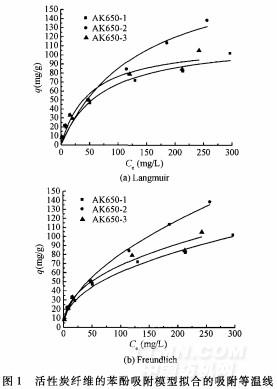 苯酚吸附等溫線分別用Langmuir模型(2)和Freundlich模型(3)描述:
