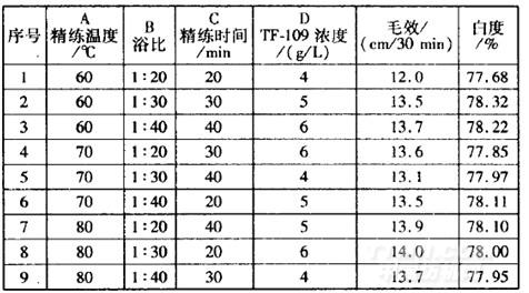 109質(zhì)量濃度>精練溫度>浴比和精練時間。優(yōu)選方案為A3B3C2D3,即TF一109質(zhì)量濃度6g,/L,浴比l:40,精練溫度8O℃,處理時間30min。影響織物白度的主次順序為:TF一109質(zhì)量濃度>浴比和精練時間>精練